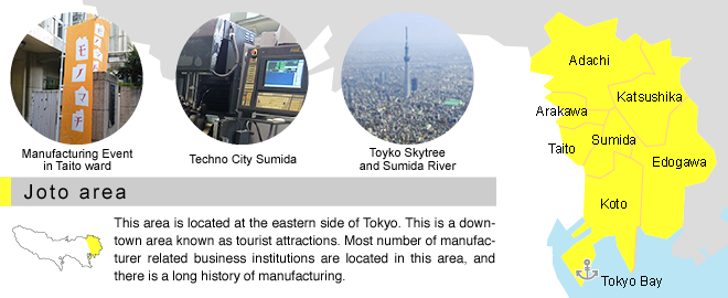 It holds the largest number of manufacturing business establishments in Tokyo, with a total of some 5,000. Nearly 40 percent of the manufacturing businesses in Tokyo are concentrated in the Joto area.