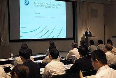 GEヘルスケア・ジャパンの毛受義雄氏が「GEヘルスケア・ジャパンの成長戦略〜課題先進国日本から世界へ」と題した基調講演を行いました。工場が日野にあるメリットとデジタル時代のものづくりを語りました。