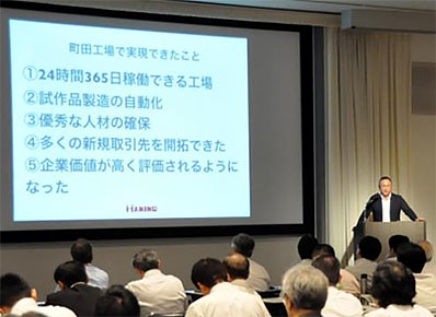 次に、牧野拳一郎氏が「東京発!次世代板金精密加工業マキノの挑戦」と題した特別講演を行い、府中市から町田市に主力工場を移転した理由と立地のメリットを語りました。