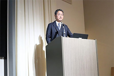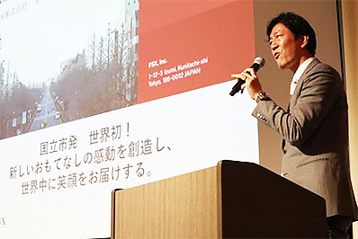 FSX株式会社(東京都国立市)の藤波克之代表取締役社長兼CEO(=写真)は、「国立発、世界初。おしぼり文化を世界に広める挑戦」と題して特別講演を行いました。おしぼりのレンタル業を手がけてきた同社は、2010年の本社機能と工場の分離を機に、生産性の改善や新製品開発に着手。高機能の製品や関連機器の開発を進め、縮小傾向にあったおしぼり業界に新風を起こしています。